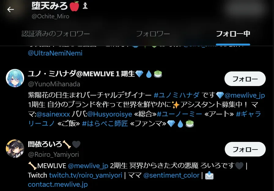たとえば、堕天みろは「ユノ・ミナハダ」「闇依ろいろ」「若魔白ソーダ」といったライバーをフォローしています。