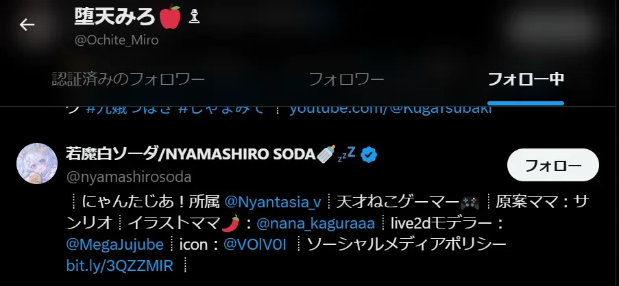具体的には、堕天みろがXでフォローしているVtuberたちが、ぎるてぃちゃんが以前にコラボしていたメンバーと一致しているんです。