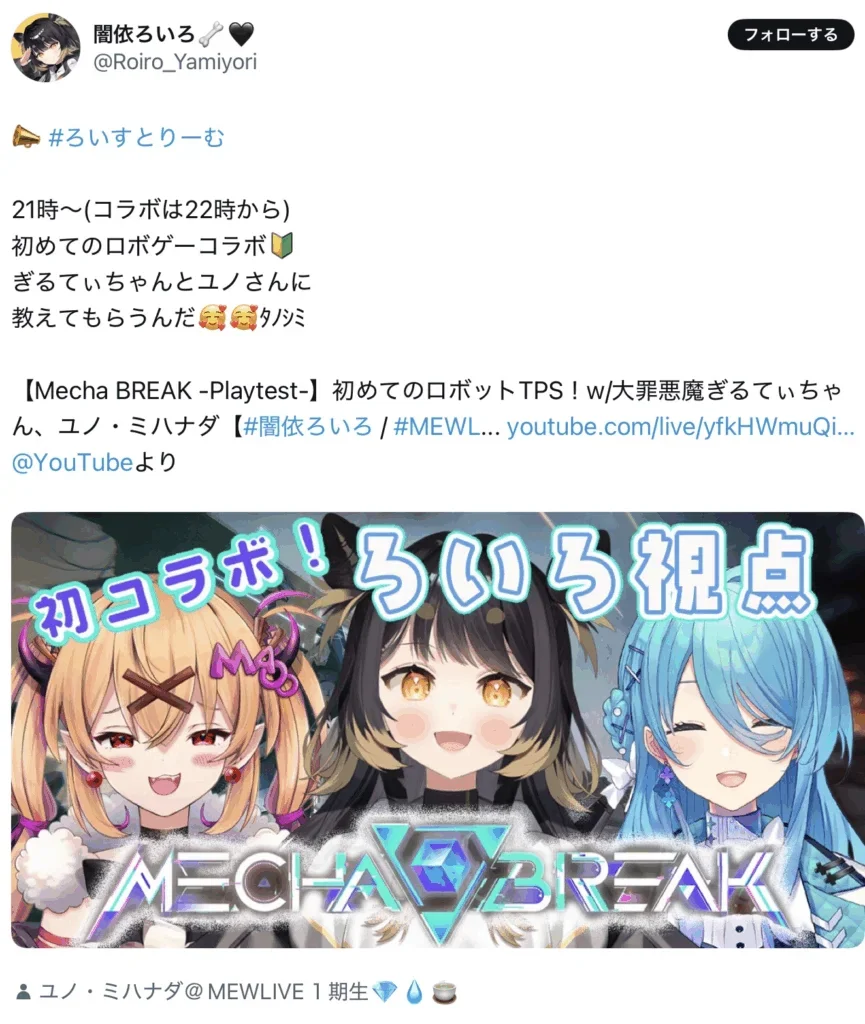 一方、ぎるてぃちゃんはすでに配信アーカイブが削除されていますが、過去のコラボ配信で同じ「メガブレイク」を遊んでいたことが確認できます。